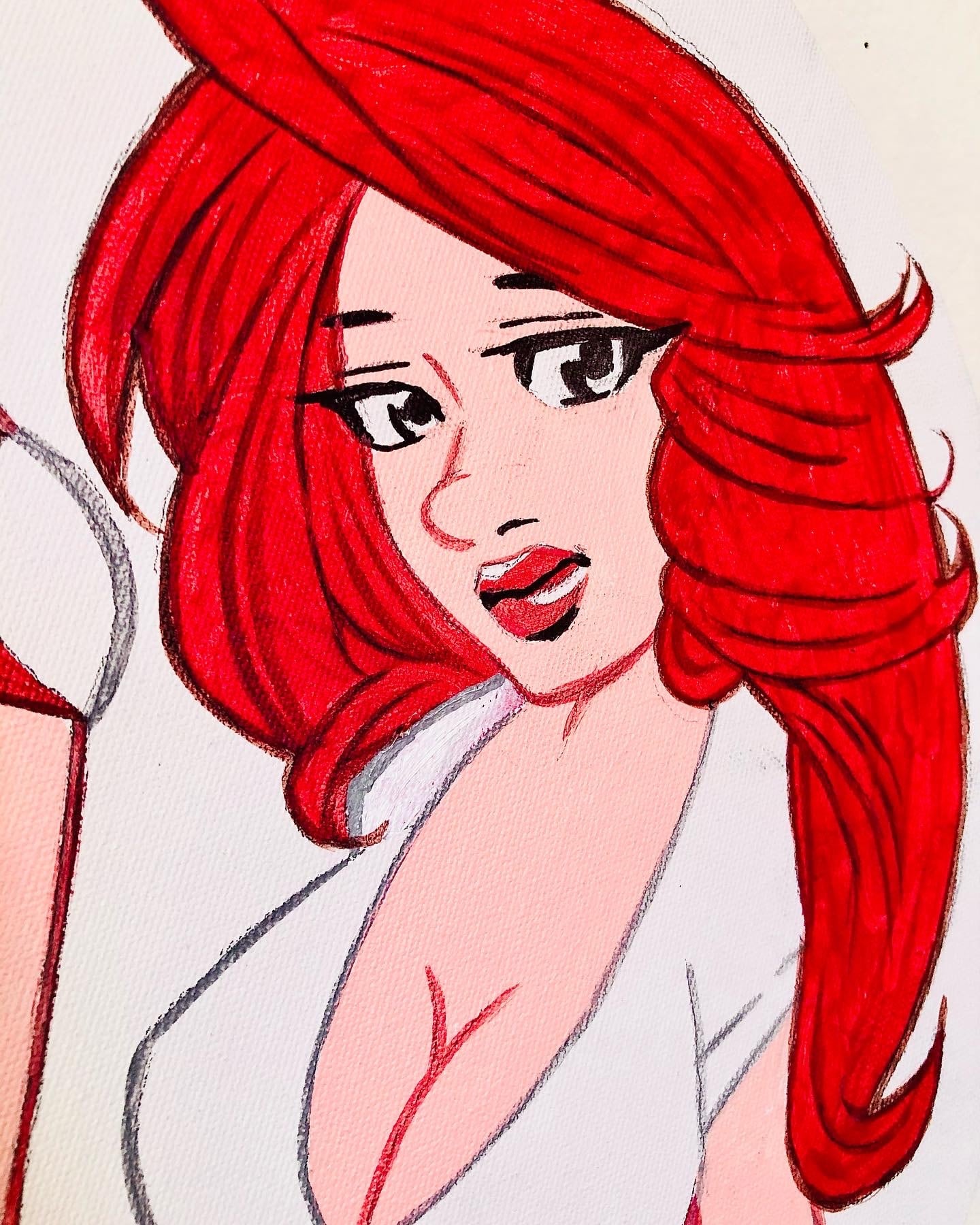 「Roller Girl」は、丸いキャンバスにアクリル絵の具で描かれた作品です。